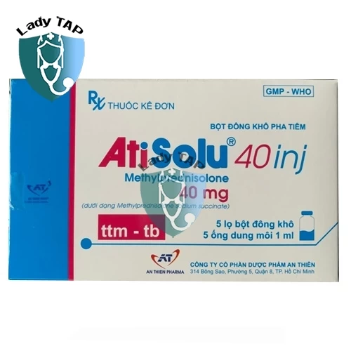 Thuốc Atisolu 40 inj là một sản phẩm của Công ty Cổ phần Dược phẩm An Thiên, được bào chế dưới dạng bột đông khô pha tiêm, có thành phần chính là methylprednisolon. Thuốc Atisolu có tác dụng giảm viêm hiệu quả, được sử dụng chủ yếu cho các tình trạng như mắc bệnh lý về da, chức năng vỏ thượng thận bất thường, bệnh về dạ dày ruột, huyết học, hô hấp, gan, mắt, thần kinh, thận, thấp khớp, viêm khớp, viêm gân,...