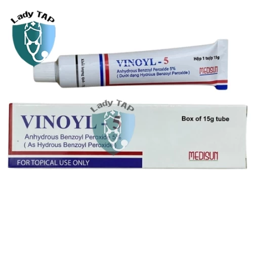 Thuốc Vinoyl-5 Medisun có thành phần chính là Anhydrous benzoyl peroxide có công dụng là điều trị mụn trứng cá hiệu quả. Thường xuyên sử dụng cần chú ý đọc kĩ hướng dẫn sử dụng và thông tin sử dụng trước khi mua sản phẩm.